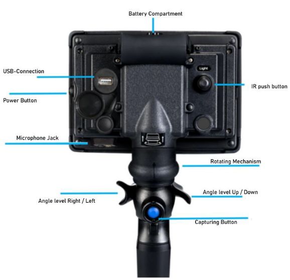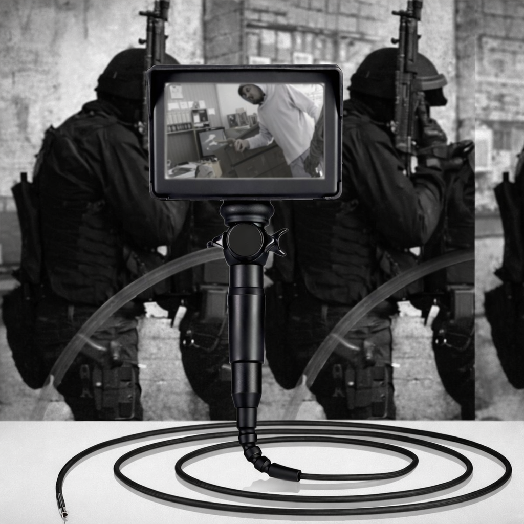 The Tactical IR Black & White Inspection Videoscope is a compact, field-deployable Remote Visual Inspection (RVI) system designed for police, security, law-enforcement, and military inspection tasks in complete darkness or low-visibility environments. The system integrates an eye-safe infrared illumination source, IR-sensitive CMOS imaging, articulated flexible probe, integrated display unit (wrist-mounted and wireless remote display options are available), and an optional microphone located at the probe distal end for synchronized audio capture.
